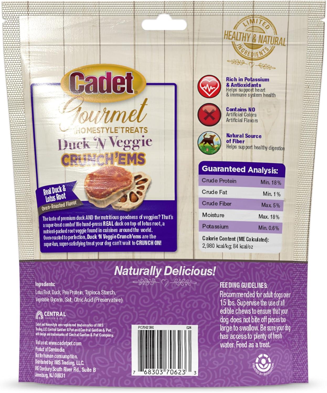 A premium dog treat that's naturally delicious and packed with nutritional goodness? That's something you can both feel good about! Cadet Gourmet Homestyle Crunch'ems are made with real duck hand-pressed on nutrient-packed lotus root for a super-treat combo. Your dog will love the satisfying crunch and savory taste—and you'll love giving them a natural treat made with quality, limited ingredients. These healthy dog treats are rich in potassium and antioxidants to support your dog's wellness, and are a natural source of fiber to promote healthy digestion. Treat your dog to oven-roasted, wholesome goodness with Cadet Gourmet Homestyle Crunch'ems.