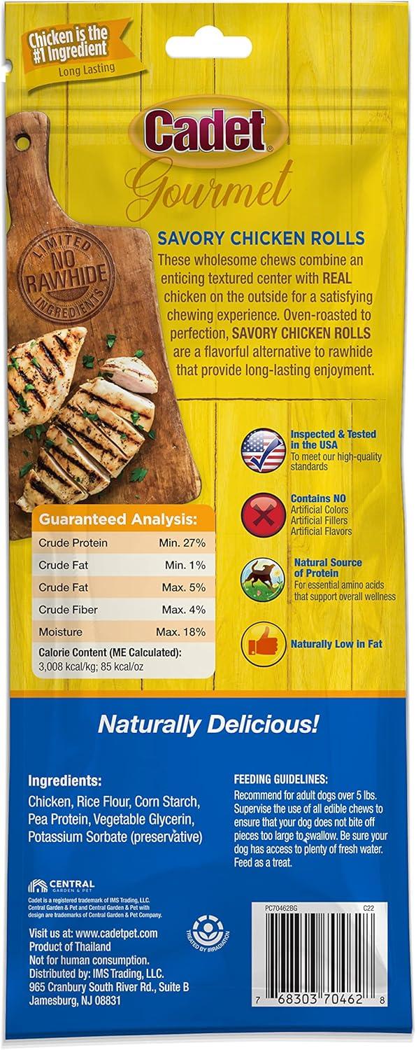 For over 30 years, Cadet has been trusted for the highest-quality dog chews and treats made from responsibly sourced ingredients. Offering a 100% rawhide-free chewing experience, our Savory Chicken Rolls are crafted with delicious chicken as the first ingredient. Featuring REAL chicken on the outside and an enticing texture on the inside, the dog rolls are oven-roasted to perfection for a flavorful alternative to rawhide that provides long lasting satisfaction. These irresistible chicken dog treats are the extra-special reward your best friend deserves!