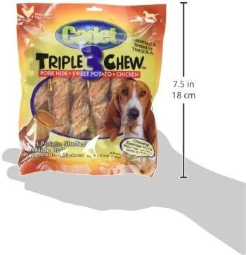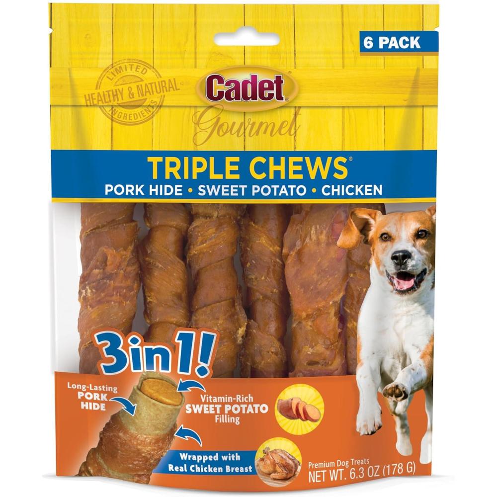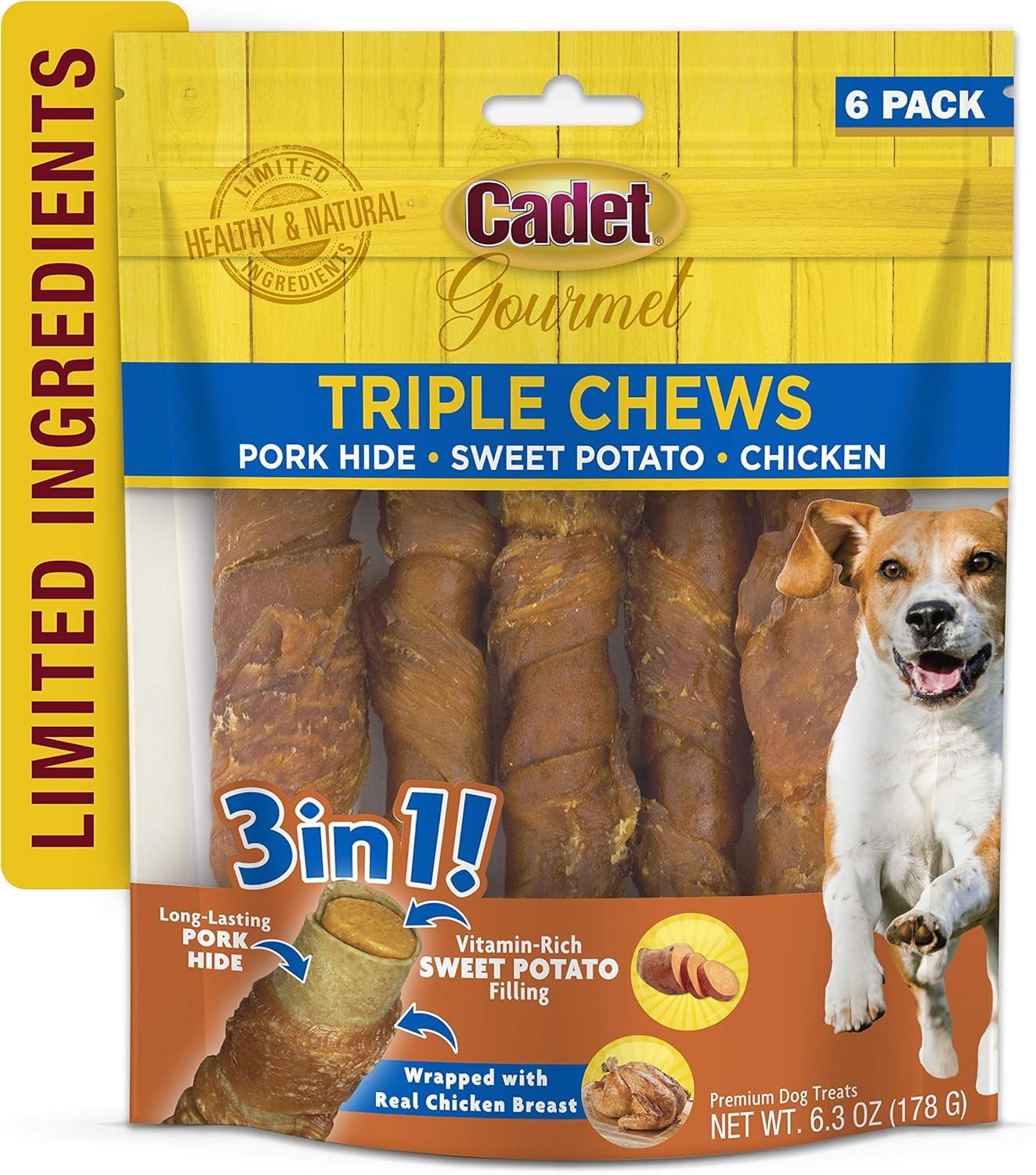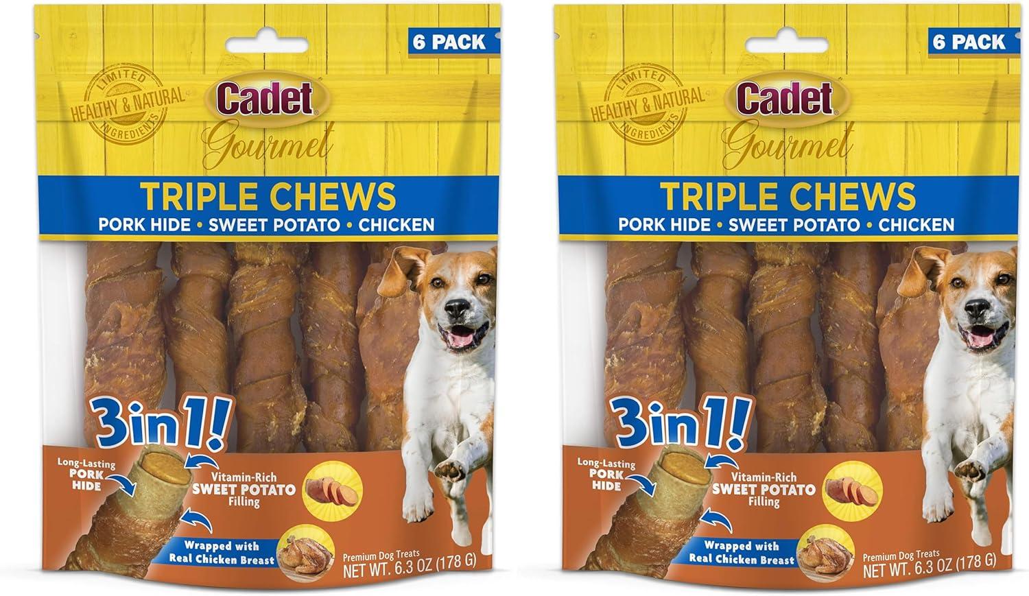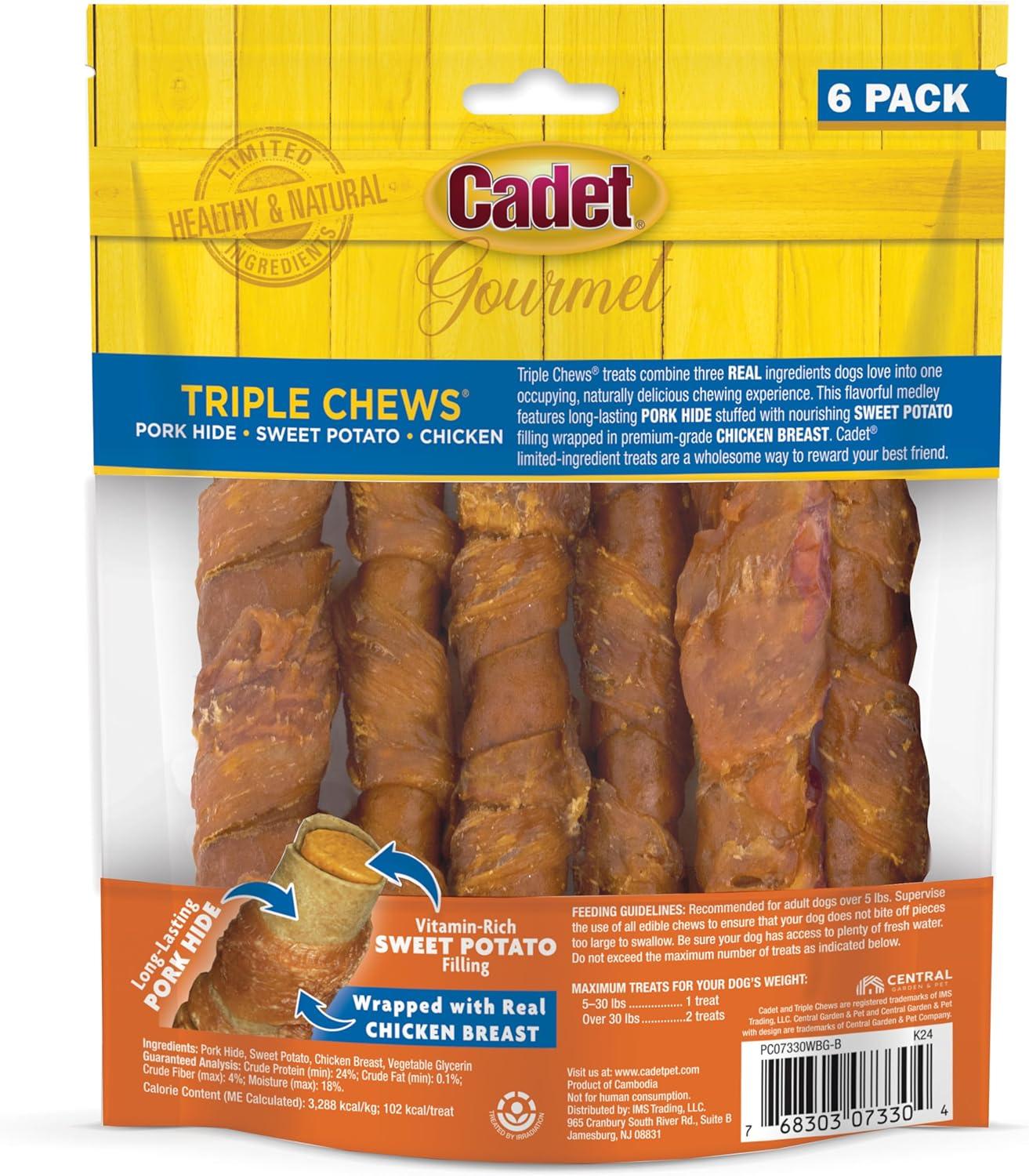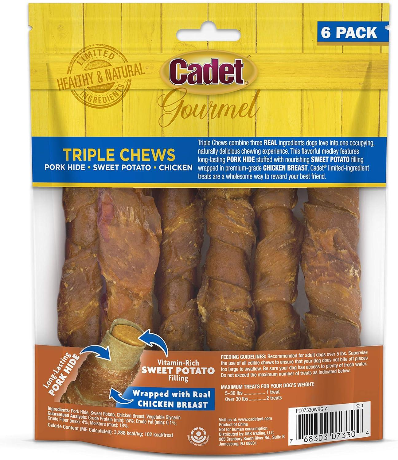 Cadet Gourmet Triple Chews Long-Lasting Pork Hide Sticks with Sweet Potato and Chicken, Healthy Dog Treats for Small & Large Dogs, 6 Count(Chicken)